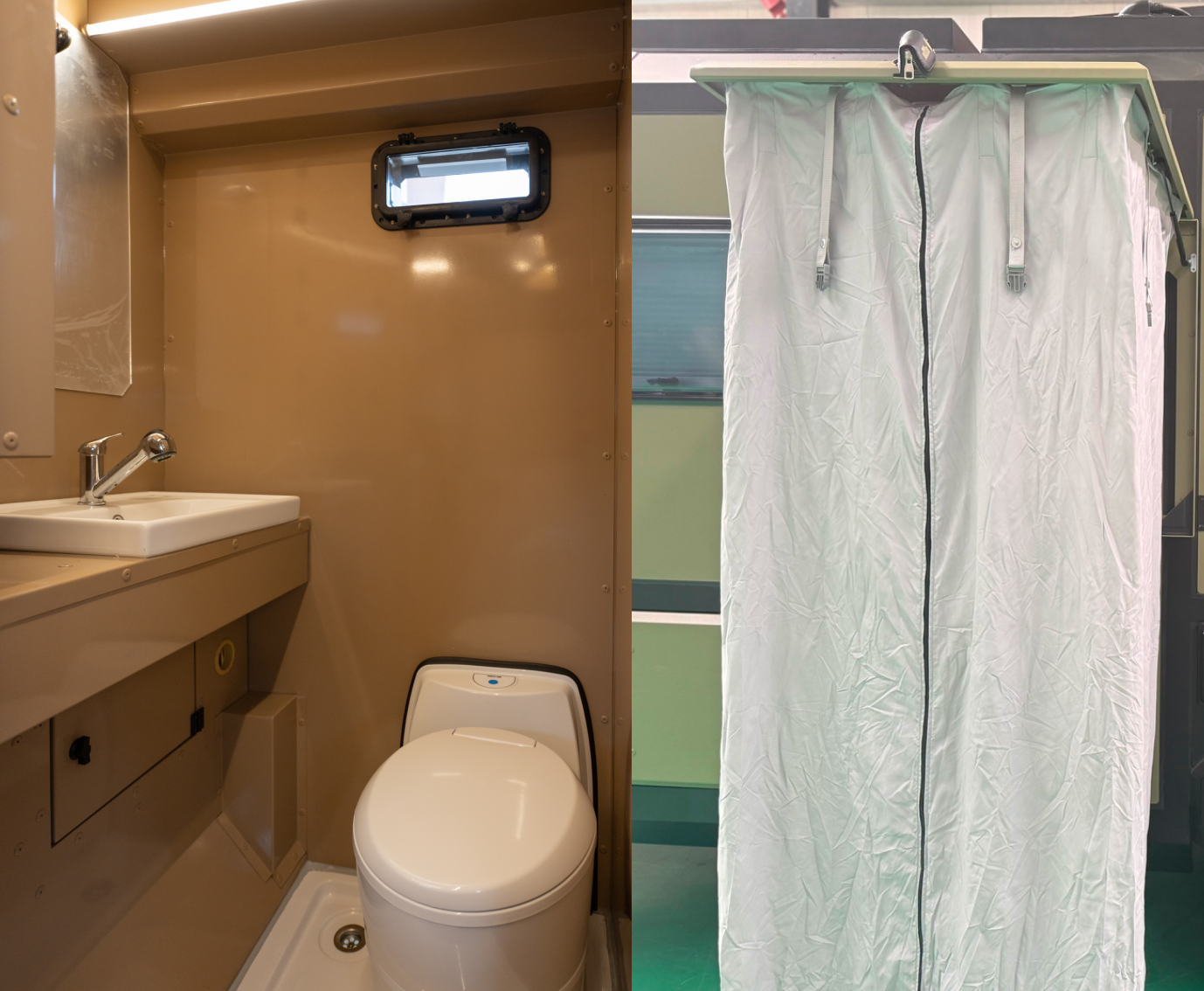 İç duş alanı, kompakt ama fonksiyonel yapısıyla sıcak-soğuk su sistemine entegre edilmiştir. Sızdırmaz kabini ve modern donanımı sayesinde karavan içinde rahat bir duş deneyimi sunar.